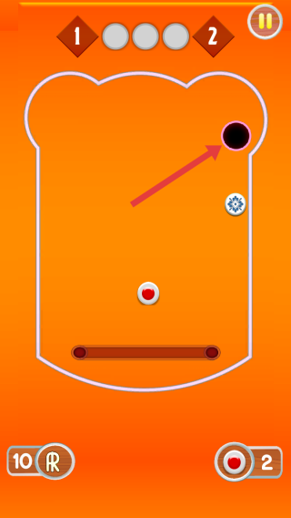 2、游戲玩家操控下方的圓盤,利用下方的裝置等,讓紅色圓盤朝著目標方向移動,準備將其送入洞口。