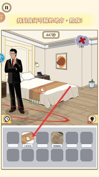 1、找到房間可疑的地方階段1,仔細觀察臥室場景,能發現入住憑證等可疑物品,將其找出推進解謎。