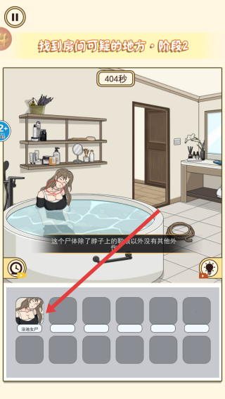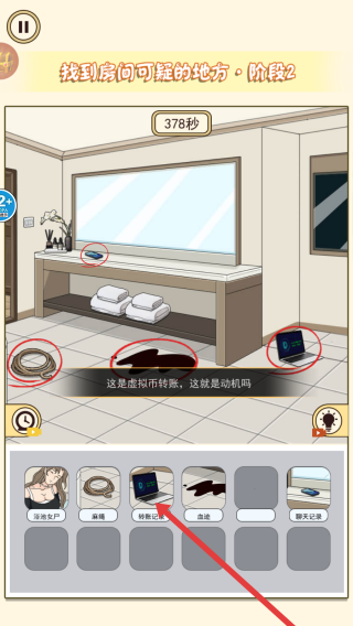 2、到階段2進入浴室場景,可看到浴缸里的尸體等可疑之處,還有虛擬貨幣傳票、血跡等線索,逐一查找。