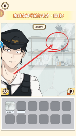 4、進入階段3觀察場景可發現破碎的鏡子等可疑之處,找出后推進到下一階段的解謎。