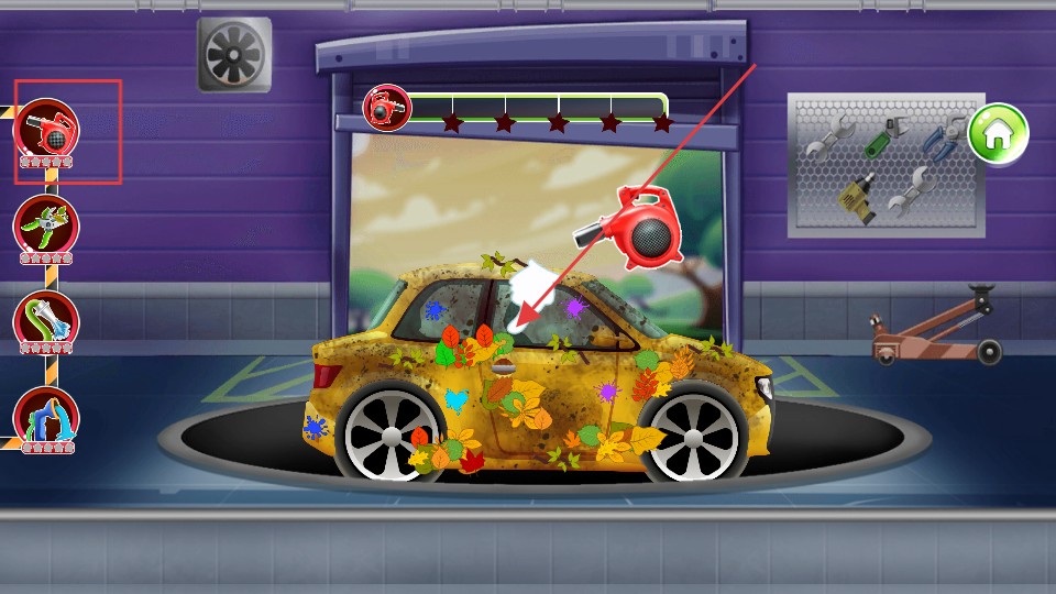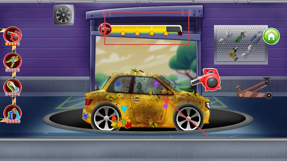 3、選擇左側的吹風類清潔工具,用其清理汽車上的落葉等雜物,同時留意上方的星級進度條,查看清潔進度。