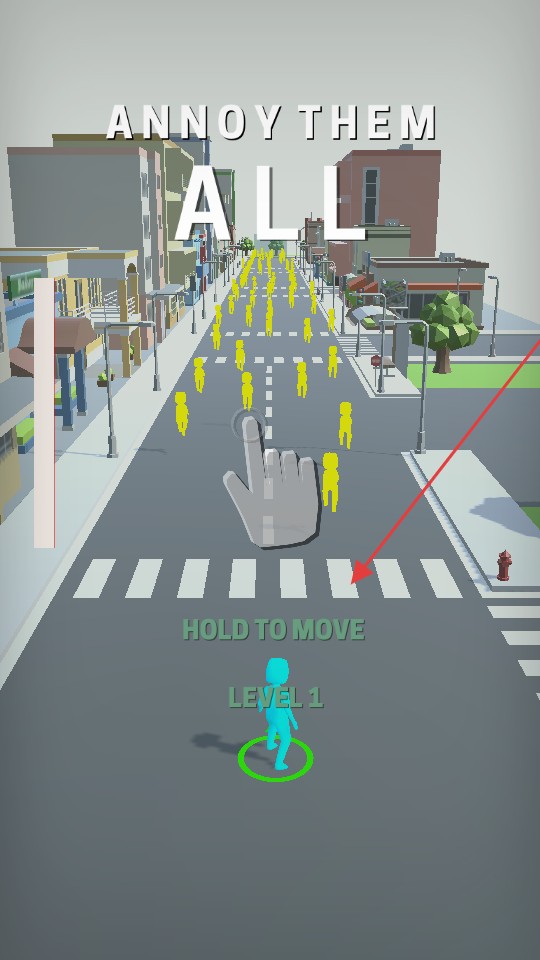 1、進入游戲街根據按住移動的提示,按住屏幕,操控藍色小人在街道上移動。
