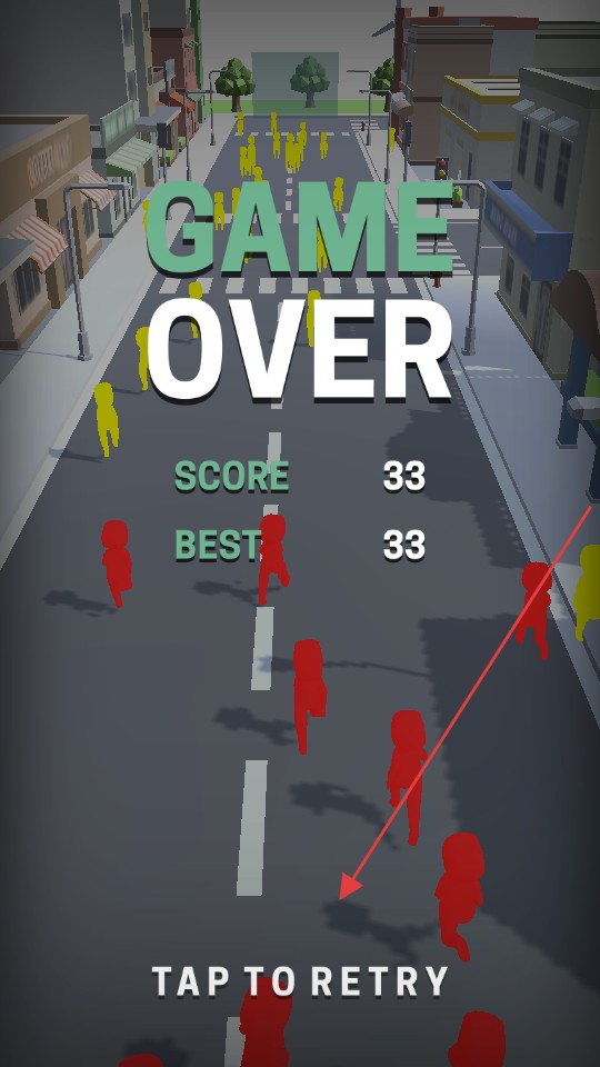 4、若操作失誤導致游戲結束,界面會顯示GAMEOVER以及當前分數和最佳分數,此時點擊TAPTORETRY,重新進入游戲,再次挑戰煩擾更多小人。