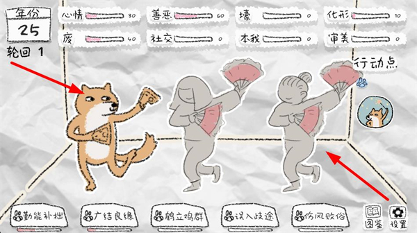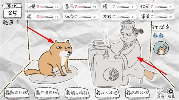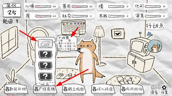 1、界面顯示年份輪回及心情善惡等屬性,選擇下方行動選項,推進角色的生活進程,積累對應屬性數值。