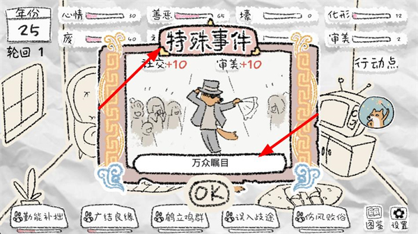 4、觸發萬眾矚目的特殊事件,獲得社交審美等屬性提升,點擊OK按鈕確認事件,繼續推進萌寵的輪回生活,解鎖更多事件內容。
