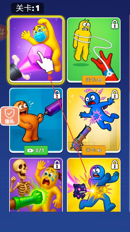 1、在關卡選擇界面點擊標有第1關的卡片,進入游戲場景,此時界面還有其他帶鎖的關卡卡片,后續可解鎖,先專注當前關卡的挑戰。