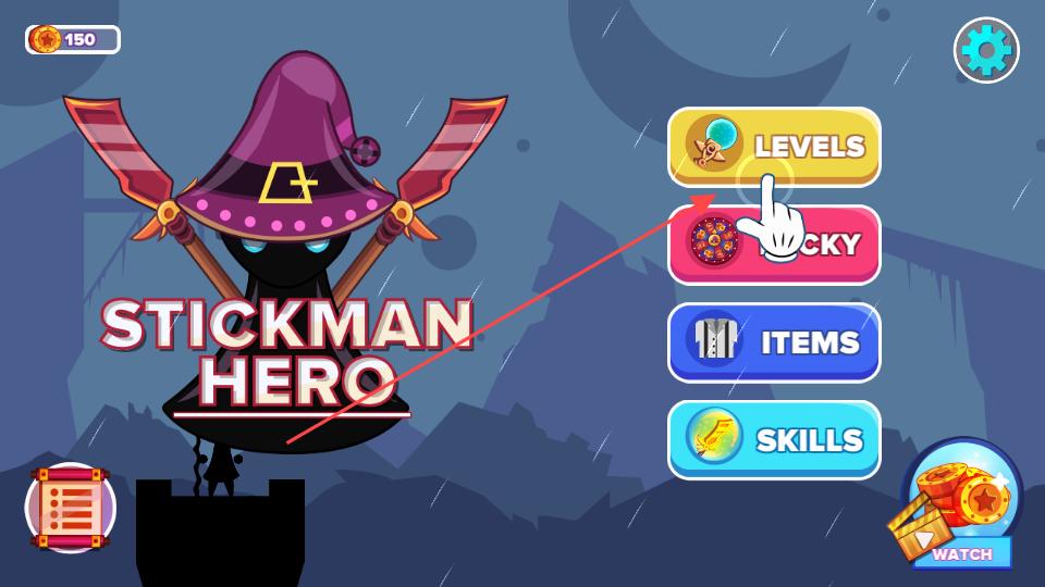 1、在游戲主界面點擊LEVELS按鈕,進入關卡選擇界面,此時界面顯示金幣數量為150,還有LUCKY、ITEMS、SKILLS等功能按鈕,可后續進行探索。