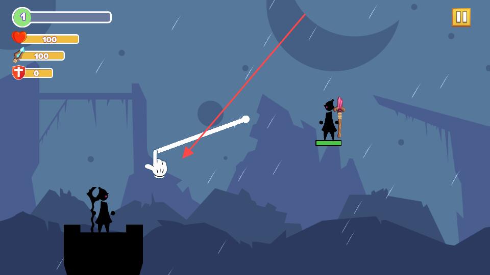 3、進入Level1的戰斗場景,左側會顯示自身的等級、生命值等屬性,按照提示拖動瞄準線,對準右側站在平臺上的敵方火柴人,調整好瞄準角度,為發起攻擊做準備。