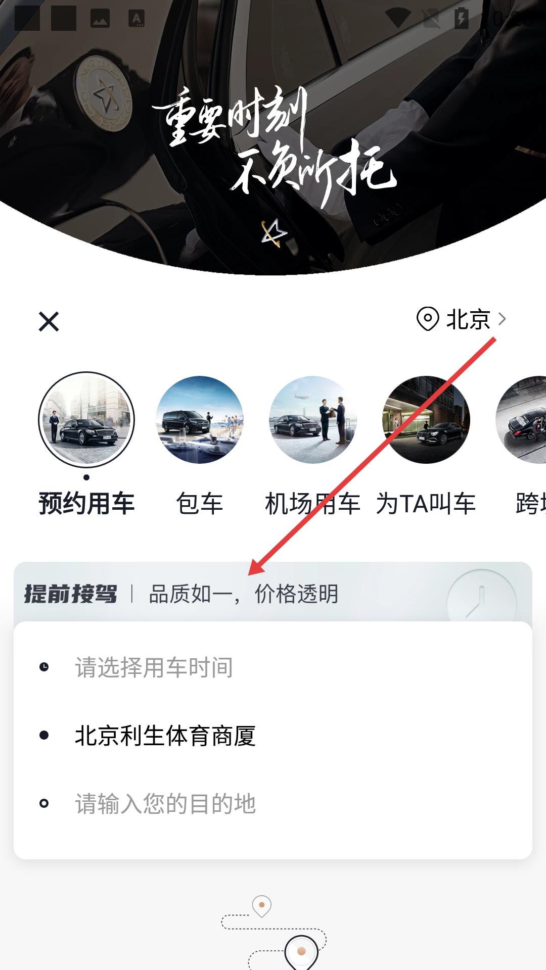2、在預約用車界面可選擇用車時間、出發地和目的地,提供預約用車、包車等多種用車服務,且價格透明。