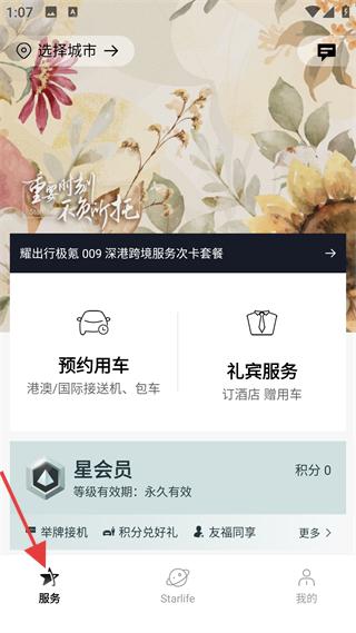 1、服務頁面提供預約用車和禮賓服務,支持城市選擇,可預訂港澳國際接送機包車,是高端出行服務的核心入口。