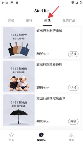 4、生活頁面展示定制行李牌等周邊,支持積分兌換,是會員用積分兌換生活好物的專屬板塊。