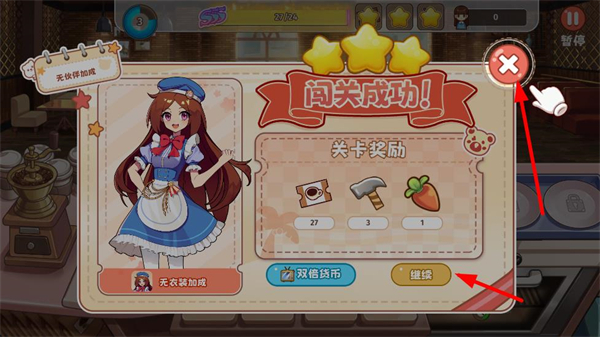 4、闖關成功后可獲得關卡獎勵,點擊繼續開啟新的經營關卡,持續提升咖啡屋的經營規模。