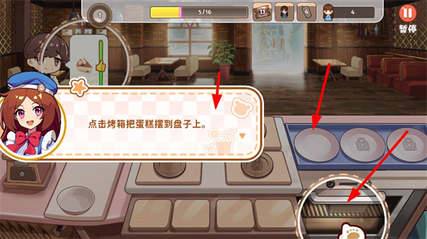 2、制作蛋糕時點擊烤箱把蛋糕擺到盤子上,完成蛋糕的制作和擺盤操作,為顧客提供餐品。