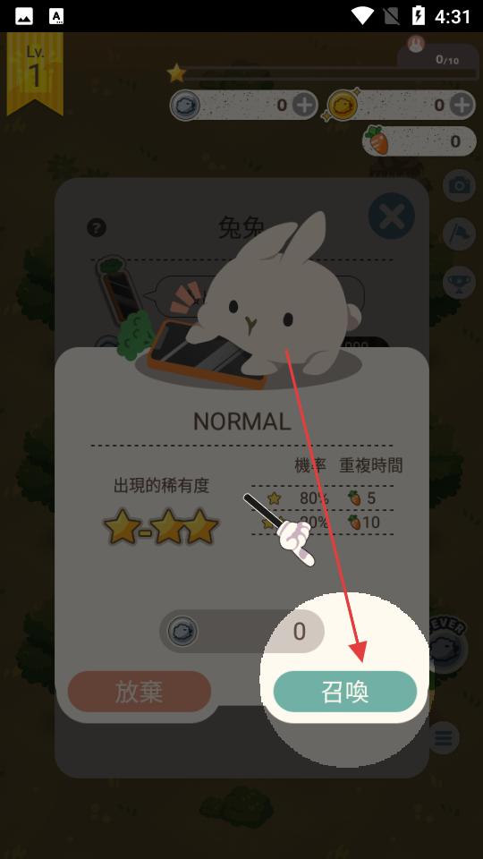 1、進入游戲后根據提示點擊下方的兔兔,進入兔兔招募界面,此時能看到不同招募類型的選項,準備開展兔兔招募操作。