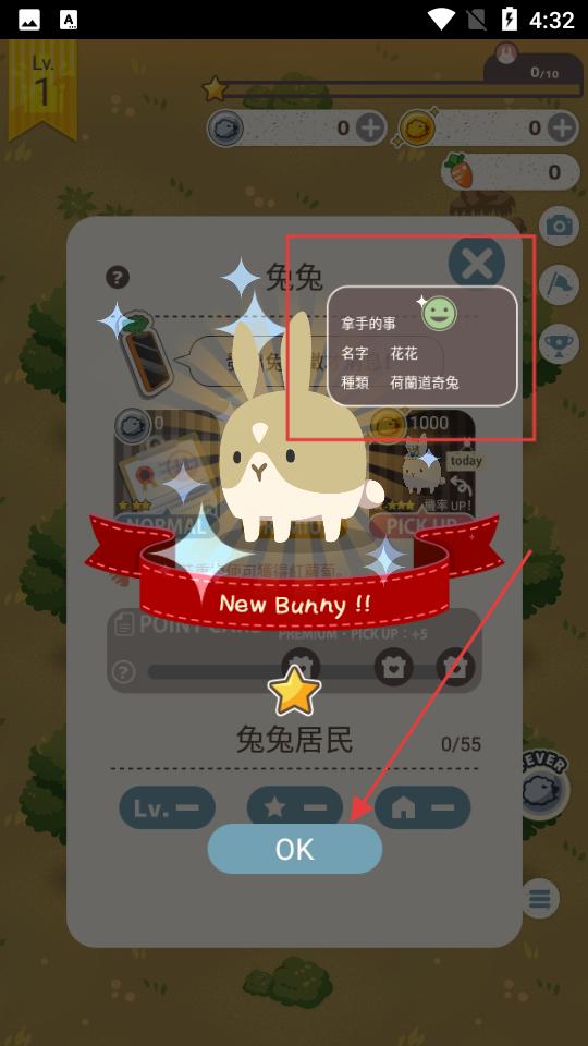 4、召喚成功后會展示新獲得的兔兔信息,包括名字、種類等,點擊OK按鈕確認,將新兔兔加入兔兔居民列表,繼續推進小鎮的經營收集進程。