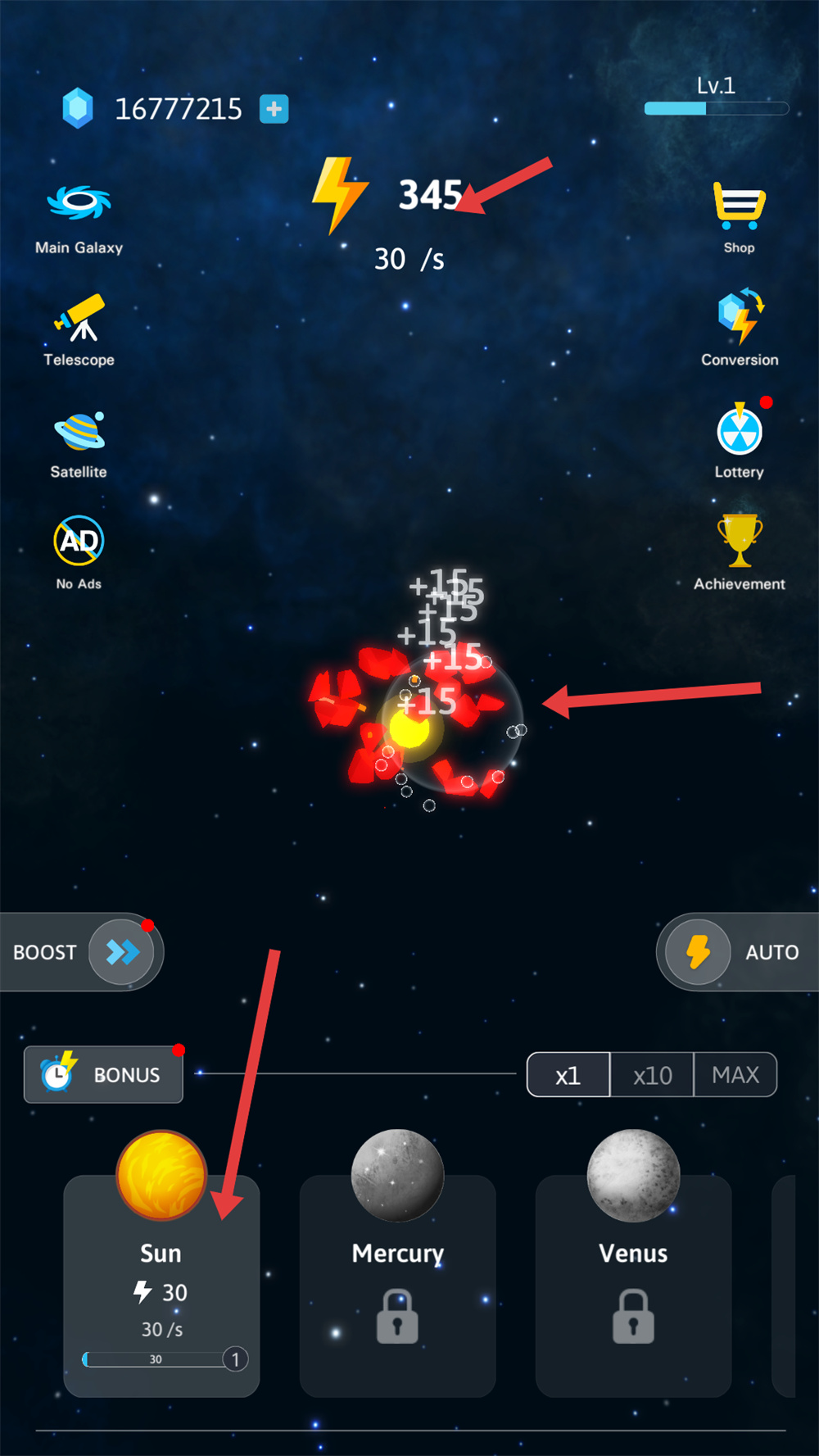 3、積累足夠能量后,解鎖太陽等天體,通過點擊太陽,能獲取能量,為后續解鎖其他天體或進行星系建設提供資源。