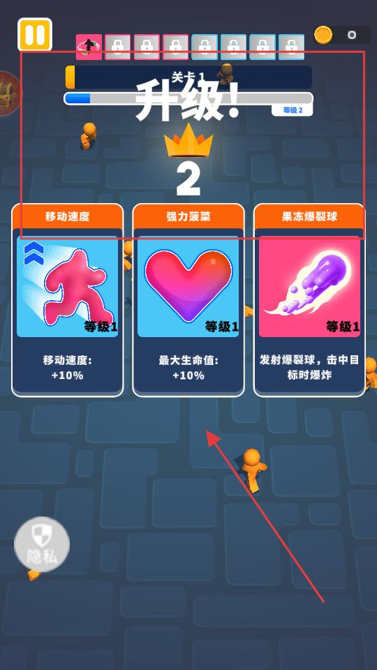 4、持續擊敗敵人積累經驗,角色升級后會彈出移動速度,強力菠菜,果凍爆裂球等升級選項,選擇其中一個強化角色能力