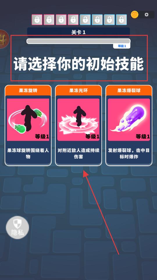 1、進入關卡1從果凍旋轉果凍光環,果凍爆裂球中選擇初始技能,選好后進入戰斗場景,操控果凍角色在場景中移動,準備應對即將出現的敵人。