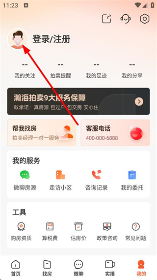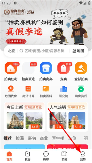 1、進入瀚海拍賣首頁,可見拍賣住宅等功能入口,還有今日上新等房源板塊,點擊底部我的按鈕,進入個人相關界面。