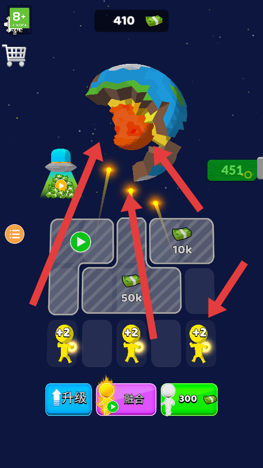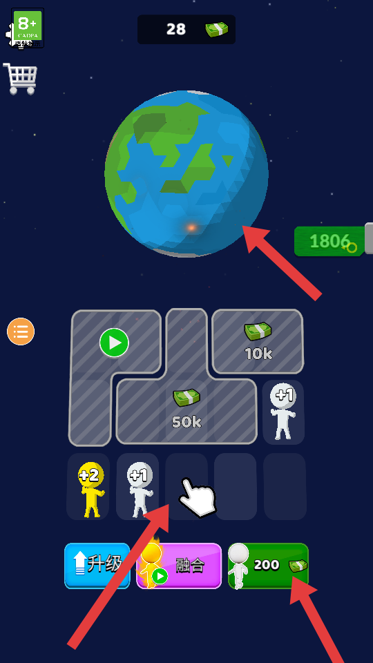 2、花費資金召喚小人,小人會對星球進行破壞,能看到星球逐漸出現變化,同時可進行升級、融合等操作增強能力。
