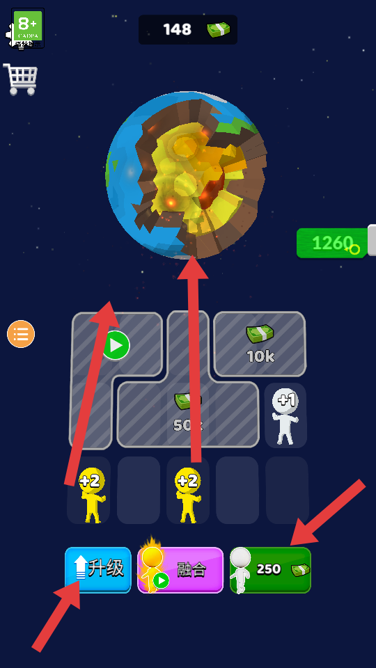 3、點擊升級按鈕,提升破壞相關的能力,讓小人更高效地破壞星球,星球會出現更明顯的破損效果。