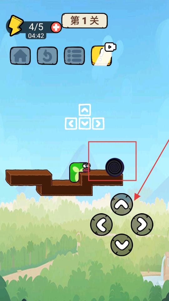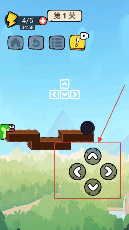 2、進入第一關后觀察右側的方向鍵,通過點擊上下左右方向鍵,控制小蛇在木質平臺上移動,嘗試熟悉小蛇的移動操作方式。