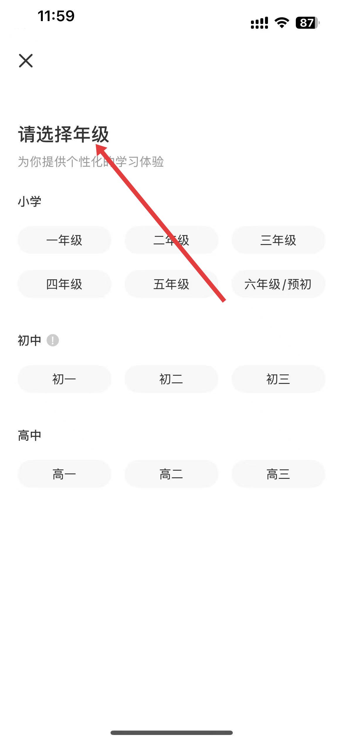 1、年級選擇界面,可選擇小學、初中、高中的不同年級,以便獲取個性化學習內容。