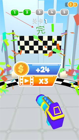 4、當成功擊倒關卡內的所有敵人,到達終點線會顯示關卡1完成,此時可獲得相應的金幣獎勵,玩家即可點擊屏幕繼續下一關。