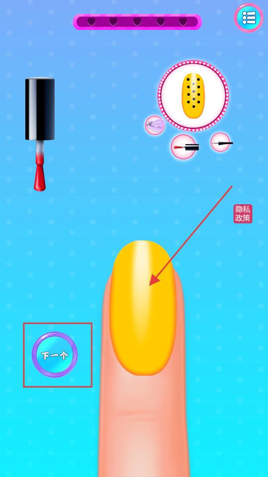 4、接著挑選指甲油,為指甲涂上顏色,涂好顏色后,點擊下一個按鈕,可繼續開展美甲的裝飾等后續步驟。
