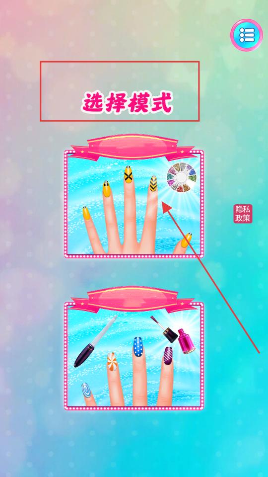 1、進入游戲后在選擇模式界面點擊上方的美甲模式,進入美甲操作場景,此時能看到待裝飾的手部,開啟好后續美甲操作的準備。