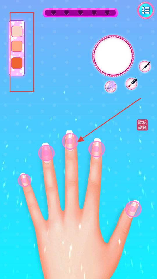 2、進入美甲場景,先對指甲進行基礎護理,點擊指甲區域,借助左側的護理工具,讓指甲變得整潔,為后續的上色等操作奠定基礎。
