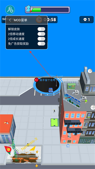 4、可以點擊游戲中的設置或菜單按鈕,打開內置MOD菜單選擇開啟2倍移動速度讓黑洞移動更快。