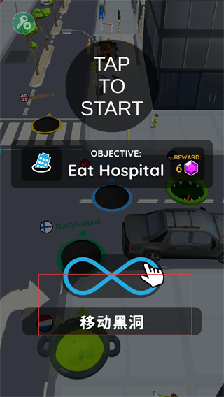 1、在游戲主界面點擊TAP TO START開始游戲,依據提示移動黑洞通過滑動屏幕來操控在城市街道場景中移動。