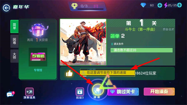 2、在嘉年華關卡選擇界面,可調節音符下落速度,根據自身節奏調整速度后開始演奏。
