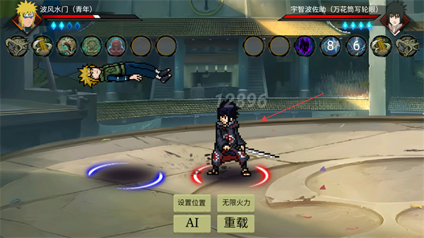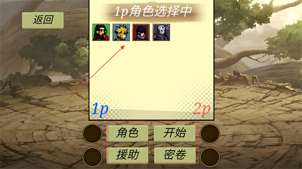 2、玩家可以在提供的角色選項中如1p角色選擇,選擇自己喜歡的忍者角色,點擊援助按鈕可以挑選援助角色來協助戰斗。