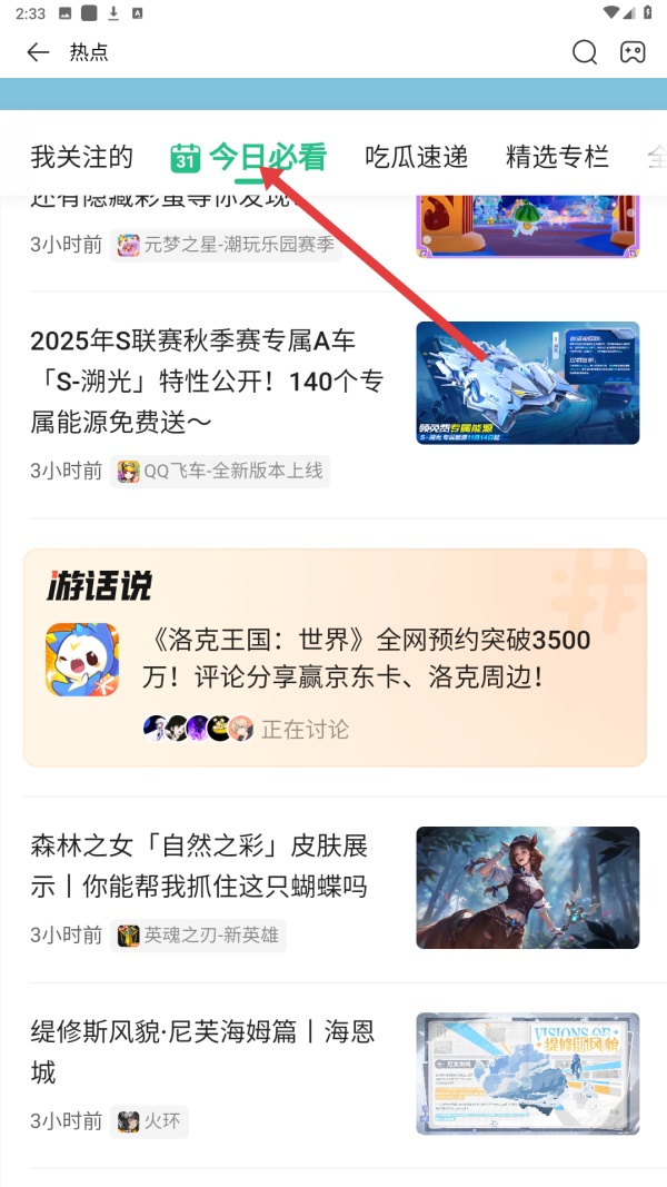 2、熱點板塊選擇今日必看欄目,可瀏覽如QQ飛車新A車、洛克王國預約等熱門游戲資訊。