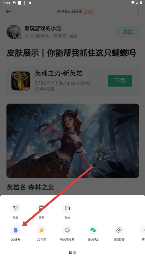 4、若想分享資訊,可分享窗口選擇QQ好友、QQ空間等方式,將游戲資訊分享給好友。