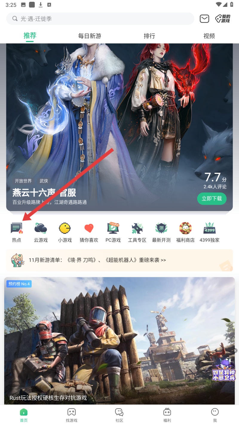 1、進入4399游戲平臺首頁,點擊熱點進入熱點板塊,可查看各類游戲熱點資訊。