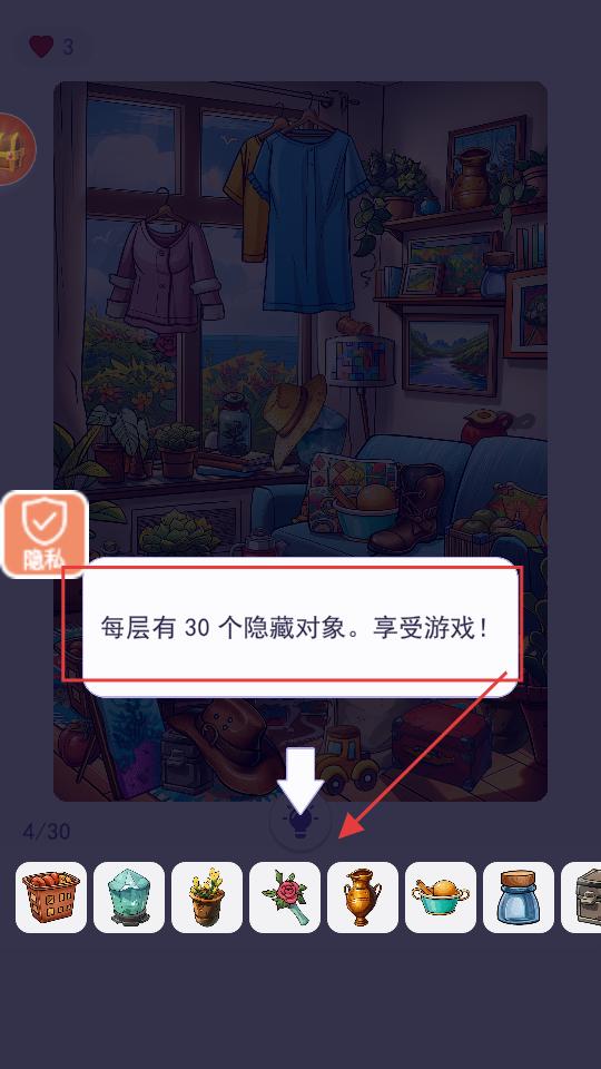 4、清楚每層有30個隱藏對象的規則后,通過不斷點擊或放大操作來尋找物品,收集到的物品會顯示在下方的物品欄中,持續尋找直到收集完該層所有隱藏物品。