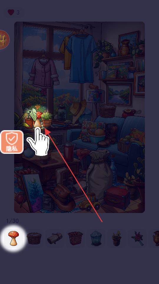 2、依照下方物品圖標的順序,留意畫面里符合的物品,當手指提示指向蘑菇時,點蘑菇,便可以收集到對應的隱藏物品,讓收集的數量增加。