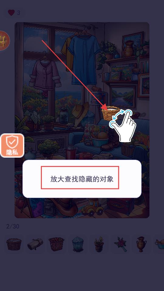 3、要是物品隱藏得比較深,當出現放大查找隱藏的對象提示時,按照手指指示的放大操作方式,對目標區域進行放大,進而找到隱藏在其中的物品。