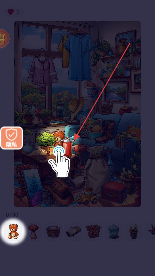 1、在房間場景里查看下方需要尋找的物品圖標,當畫面中小熊出現感應提示時,點擊小熊,就能成功找到對應的隱藏物品,推進收集的進度。