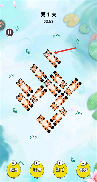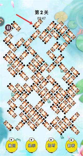 4、關卡2策略面對更為復雜的老虎排列,需要巧用提示找隱藏連線,或翻轉調整圖案規劃路徑快速消除。