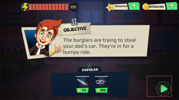 1、在游戲主界面閱讀任務提示,了解到強盜試圖偷車,需要給他們點教訓,玩家點擊播放按鈕,進入游戲關卡。