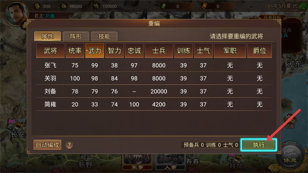 4、在重編界面可查看武將的統率、武力、智力等屬性,選擇要重編的武將后點擊執行按鈕,完成軍隊重編操作。