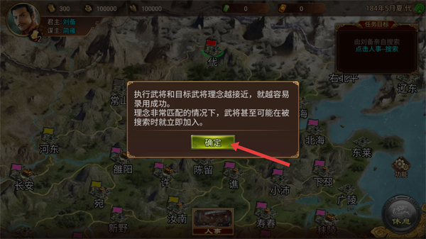 2、招募武將時,執行武將和目標武將理念越接近越容易錄用成功,理念匹配時武將可能在搜索時立即加入,點擊確定了解規則。