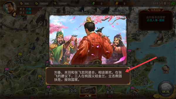 1、會觸發桃園結義劇情,劉備、關羽和張飛志同道合,在張飛建議下結義,立志救國扶危報效國家。