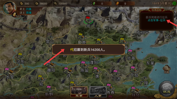 3、可在城市代招募新兵,如招募到新兵16200人,同時可查看任務目標,如多派簡雍進行征兵,推進征兵進程。