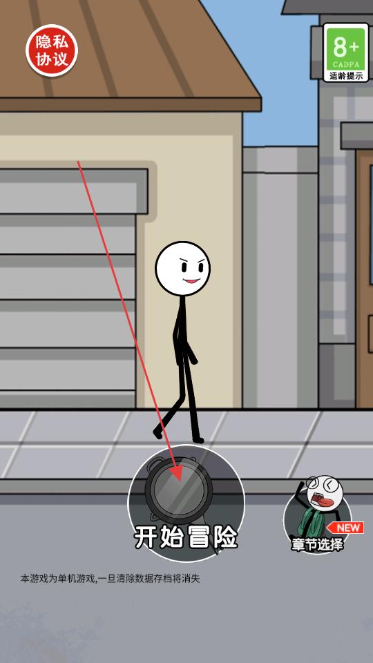 1、在游戲初始界面點擊開始冒險按鈕,進入冒險場景,火柴人處于新環境,準備迎接后續抉擇與挑戰。