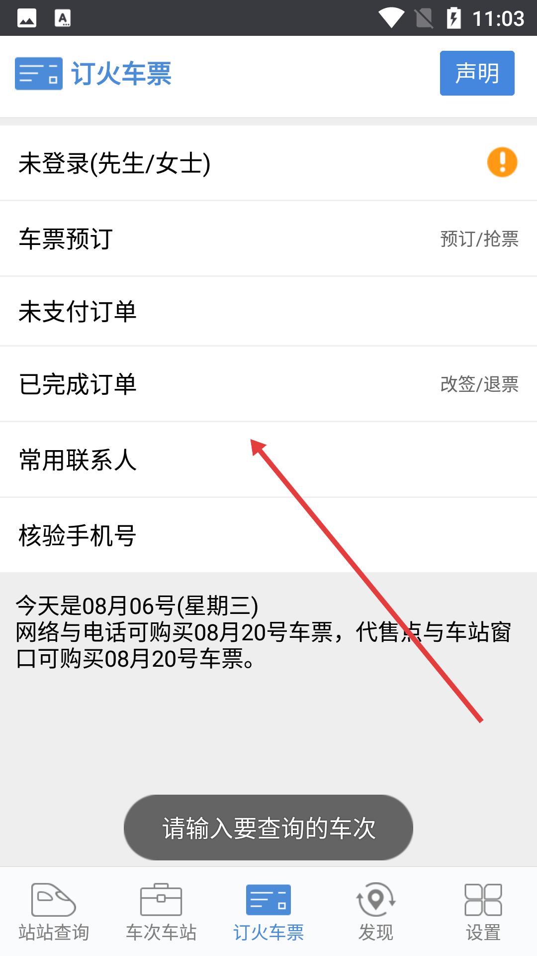 2、進入訂火車票頁面能進行車票預訂、查看未支付和已完成訂單,還可管理常用聯系人、核驗手機號,便捷處理票務。